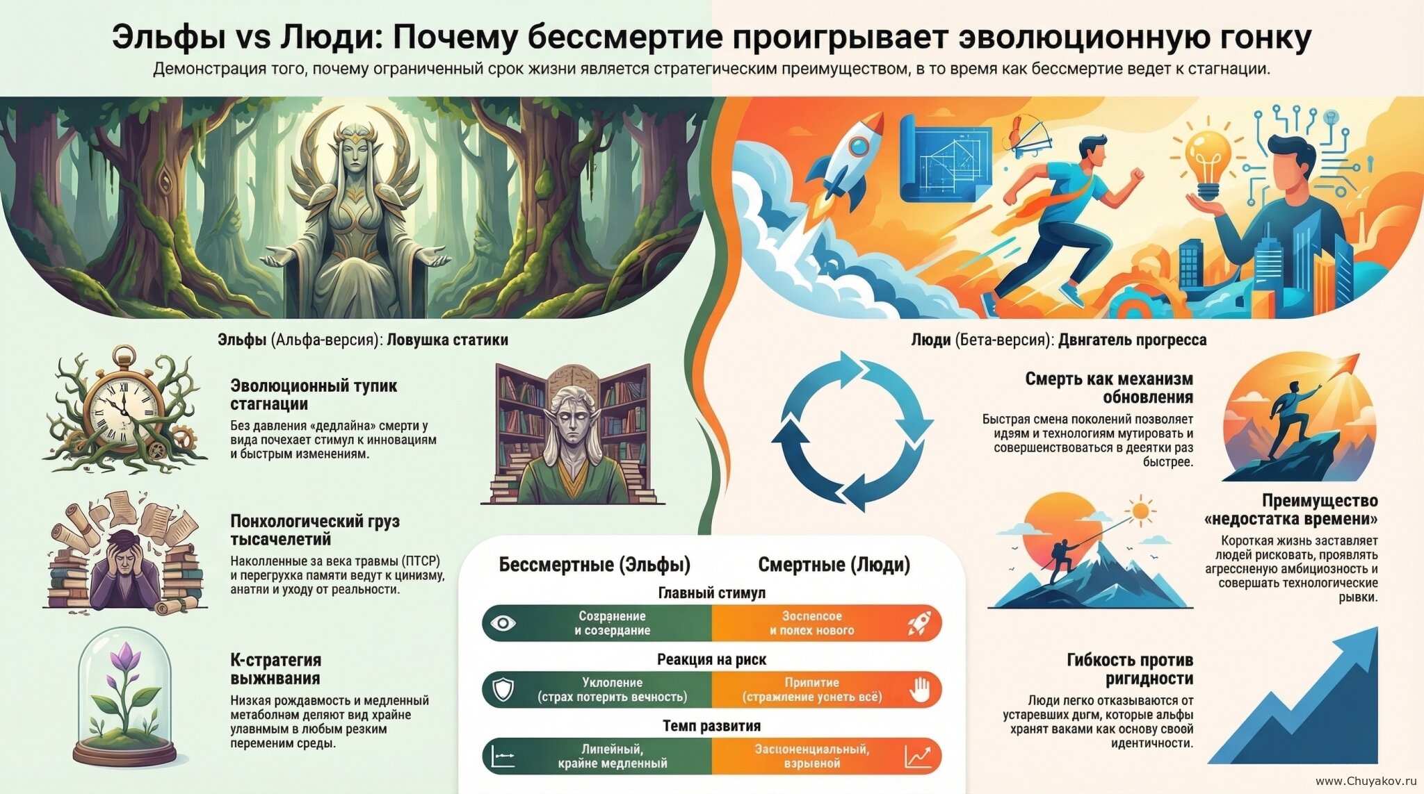 Вывод: Психологически устойчивый эльф — это тот, кто выработал механизмы защиты: притупление эмоций, отстранённость, нежелание рисковать. Но именно эти механизмы делают его плохим конкурентом для амбициозных, эмоциональных, готовых на риск людей.