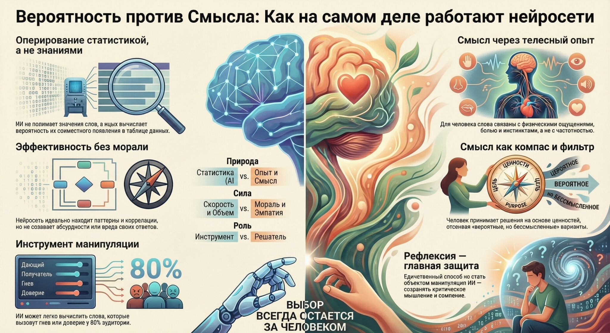 Единственная защита — это человеческая рефлексия. Способность задать вопрос: «А не пытаются ли мной сейчас управлять?», «А не слишком ли удобен этот ответ?», «А не выглядит ли этот лозунг как идеально сконструированная вероятностная комбинация?».