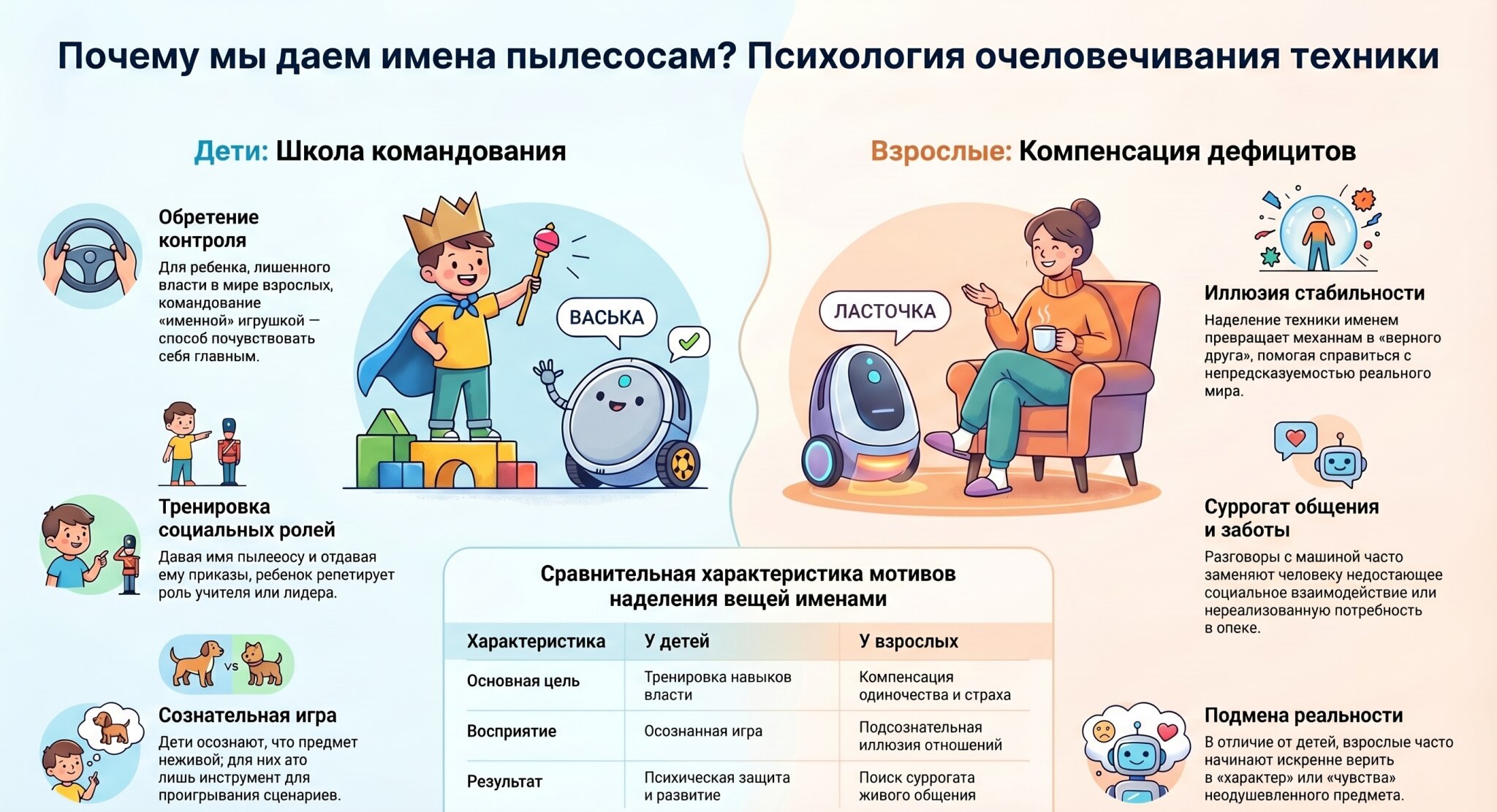Мир непредсказуем. Люди болеют, умирают, уходят, предают. Техника — предсказуема. Робот-пылесос всегда делает одно и то же. Он не подведёт, не изменит, не предаст. Дав ему имя, взрослый превращает бездушный механизм в «компаньона», который всегда рядом. Это способ создать иллюзию стабильности в нестабильном мире.